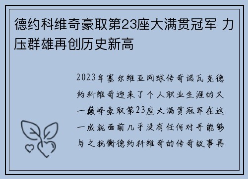 2023年,塞尔维亚网球传奇诺瓦克·德约科维奇迎来了个人职业生涯的又一巅峰——豪取第23座大满贯冠军。在这一成就面前,几乎没有任何对手能够与之抗衡,德约科维奇的传奇故事再次升华。第23座大满贯的辉煌,...