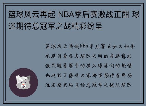篮球风云再起,NBA季后赛正如火如荼地进行着,各支球队之间的角逐愈发激烈。随着赛季的深入,球迷们的热情也达到了巅峰,大家都在期待着那场注定精彩纷呈的总冠军之战。从球队的战术变化到球员的个人表现,再到球...