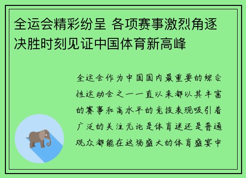 全运会作为中国国内最重要的综合性运动会之一,一直以来都以其丰富的赛事和高水平的竞技表现吸引着广泛的关注。无论是体育迷还是普通观众,都能在这场盛大的体育盛宴中看到中国体育的风采和实力。2021年全运会,...