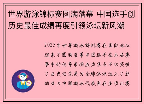 2025年世界游泳锦标赛在国际泳坛迎来了圆满落幕,中国选手在本届赛事中的优异表现成为焦点,不仅突破了历史记录,更为全球泳坛注入了新的活力。中国游泳代表团在多项比赛中取得了突破性的成绩,展现了强大的综合...
