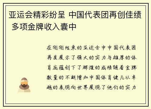 在刚刚结束的亚运会中,中国代表团再度展示了强大的实力与雄厚的体育底蕴,创下了辉煌的成绩。随着金牌数量的不断增加,中国体育健儿以卓越的表现,向世界展现了他们的实力与风采。在多个项目中,中国代表团不仅继续...