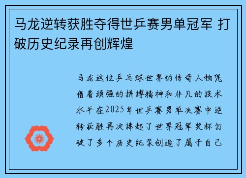 • 马龙逆转获胜夺得世乒赛男单冠军 打破历史纪录再创辉煌