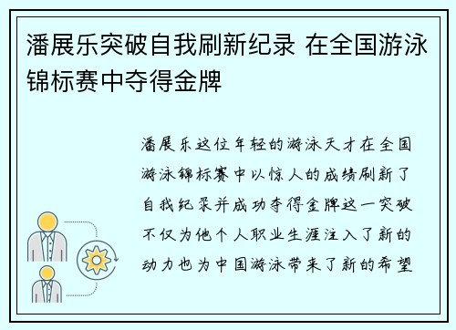 潘展乐,这位年轻的游泳天才,在全国游泳锦标赛中以惊人的成绩刷新了自我纪录,并成功夺得金牌。这一突破,不仅为他个人职业生涯注入了新的动力,也为中国游泳带来了新的希望。在这篇文章中,我们将从四个方面来详细...
