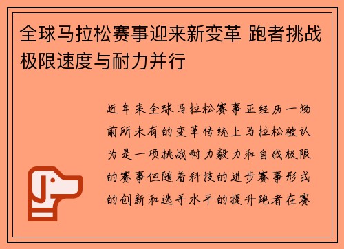 近年来,全球马拉松赛事正经历一场前所未有的变革。传统上,马拉松被认为是一项挑战耐力、毅力和自我极限的赛事,但随着科技的进步、赛事形式的创新和选手水平的提升,跑者在赛事中的表现不仅仅限于单一的耐力比拼。...
