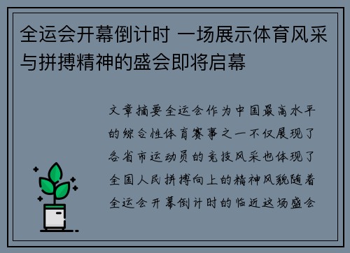 文章摘要:全运会,作为中国最高水平的综合性体育赛事之一,不仅展现了各省市运动员的竞技风采,也体现了全国人民拼搏向上的精神风貌。随着全运会开幕倒计时的临近,这场盛会已成为全社会关注的焦点。本文将从四个方...