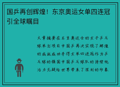 • 国乒再创辉煌!东京奥运女单四连冠引全球瞩目