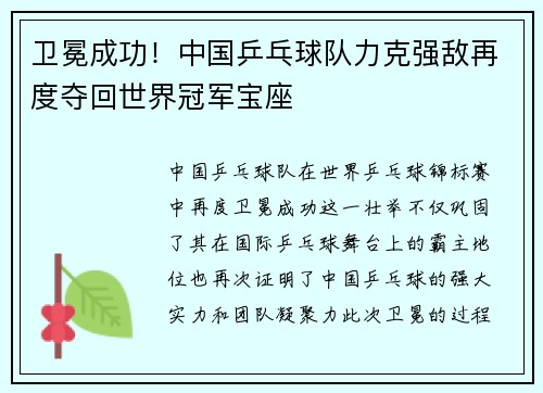 • 卫冕成功!中国乒乓球队力克强敌再度夺回世界冠军宝座