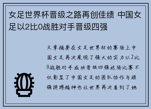 • 女足世界杯晋级之路再创佳绩 中国女足以2比0战胜对手晋级四强