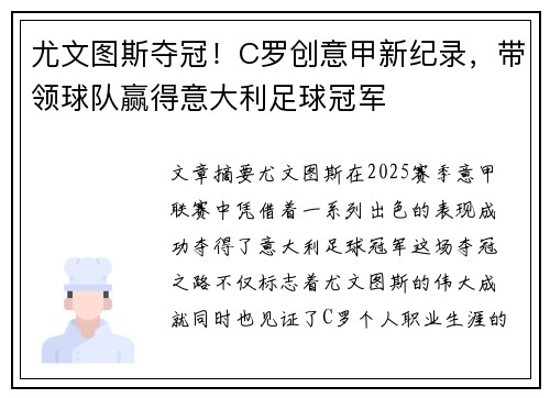 文章摘要:尤文图斯在2025赛季意甲联赛中凭借着一系列出色的表现,成功夺得了意大利足球冠军。这场夺冠之路不仅标志着尤文图斯的伟大成就,同时也见证了C罗个人职业生涯的新高峰。在本赛季,C罗创造了新的意甲...