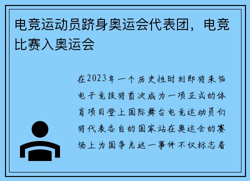 在2023年,一个历史性时刻即将来临:电子竞技将首次成为一项正式的体育项目,登上国际舞台。电竞运动员们将代表各自的国家,站在奥运会的赛场上,为国争光。这一事件不仅标志着电竞行业的重大突破,也预示着体育...