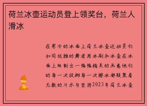 在寒冷的冰面上,荷兰冰壶运动员们如同优雅的舞者,用冰刷和冰壶在冰面上绘制出一幅幅精美的画卷。他们的每一次投掷、每一次擦冰,都凝聚着无数的汗水与坚持。2023年,荷兰冰壶队在国际冰壶赛事中再次创造历史,...