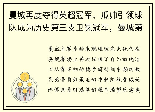 曼城本赛季的表现堪称完美,他们在英超赛场上再次证明了自己的统治力。从赛季初的稳步前行,到中期的激烈竞争,再到最后的冲刺阶段,曼城始终保持着对冠军的强烈渴望。瓜迪奥拉的战术体系再一次发挥了重要作用,他的...