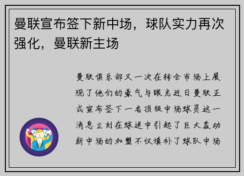 曼联俱乐部又一次在转会市场上展现了他们的豪气与眼光!近日,曼联正式宣布签下一名顶级中场球员,这一消息立刻在球迷中引起了巨大轰动。新中场的加盟,不仅填补了球队中场的空白,更让外界对曼联的未来充满期待。 ...