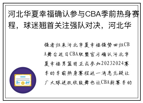 强者归来:河北华夏幸福强势回归CBA舞台 近日,CBA联盟官方确认,河北华夏幸福男篮将正式参加2023-2024赛季的季前热身赛程。这一消息无疑让广大球迷欢欣鼓舞,也让CBA新赛季的序幕更加引人注目。...