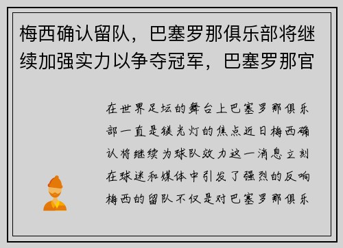 在世界足坛的舞台上,巴塞罗那俱乐部一直是镁光灯的焦点。近日,梅西确认将继续为球队效力,这一消息立刻在球迷和媒体中引发了强烈的反响。梅西的留队不仅是对巴塞罗那俱乐部的极大鼓舞,也为全球的足球迷们带来了期...