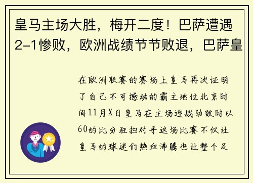 在欧洲联赛的赛场上,皇马再次证明了自己不可撼动的霸主地位。北京时间11月X日,皇马在主场迎战劲敌时,以6-0的比分狂扫对手,这场比赛不仅让皇马的球迷们热血沸腾,也让整个足坛为之震撼。其中,C罗的表现尤...