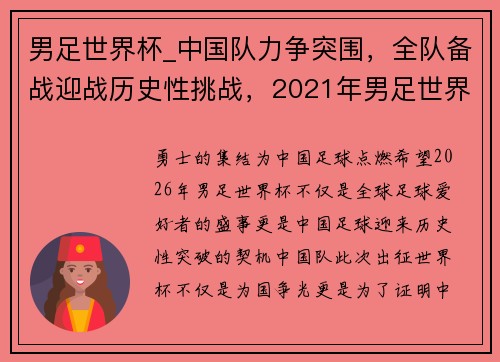 勇士的集结,为中国足球点燃希望 2026年男足世界杯不仅是全球足球爱好者的盛事,更是中国足球迎来历史性突破的契机。中国队此次出征世界杯,不仅是为国争光,更是为了证明中国football的潜力与实力。全...