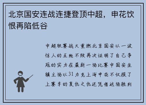 中超联赛战火重燃,北京国安以一波惊人的五轮不败,再次证明了自己争冠的实力。在最新一场比赛中,国安坐镇主场,以3-1力克上海申花,不仅报了上赛季的复仇之仇,还凭借这场胜利登顶积分榜。这场比赛不仅展现了国...