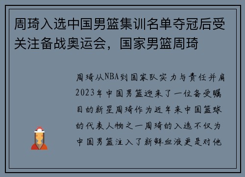 周琦:从NBA到国家队,实力与责任并肩 2023年,中国男篮迎来了一位备受瞩目的新星——周琦。作为近年来中国篮球的代表人物之一,周琦的入选不仅为中国男篮注入了新鲜血液,更是对他在国际舞台上的表现的认可...
